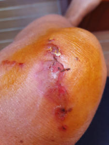 Ich habe am Knie Kontakt mit einer Feuerqualle. Es brennt. Ich weiss, dass ich die Stellen nicht