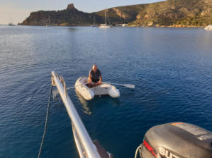 Durchfall! Martin geht morgens mit dem Dinghi an Land zu einer Apotheke. Wir hängen hier 3 Tage bei großer Hitze fest. Es geht