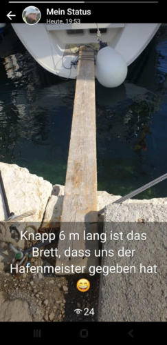 Gut, dass wir noch eine 2. Heckleine ausgebracht hatten. Der Schwimmsteg selbst