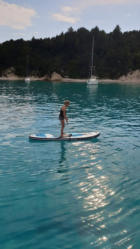 Nachdem wir heute beim Frühstück beschlossen haben, morgen weiterzusegeln, machen wir erst einen Paddelausflug mit dem SUP zum linken Ufer und baden