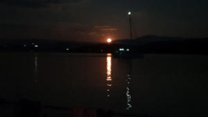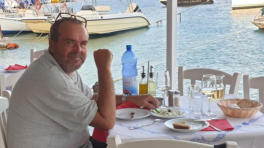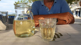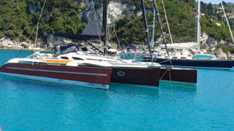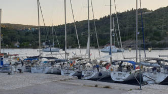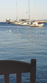 Abends als wir in der Taverne auf das Essen warten, legt ein Catamaran direkt vor dem Restaurant mit Unterstützung von Kostas an.