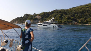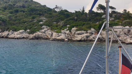 machen. Gegen Mittag wird der Wind angestellt und ein mittelgrößes Motorboot, welches mehr oder weniger parallel von uns ankert, kommt uns beim Schwojen