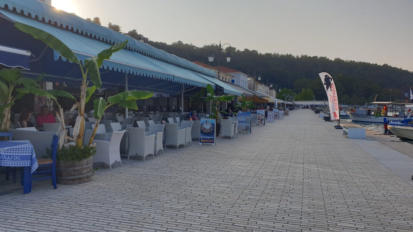 Danach gehen wir in ein Restaurant direkt am Hafen. Dort fällt, nachdem wir schon gegessen haben, eine Reisegruppe aus einem Bus ein. Es gibt Häppchen