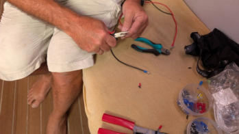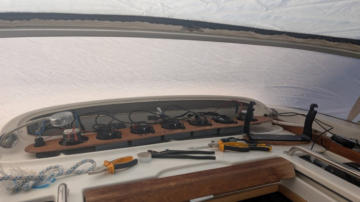 weißen Dichtungsmittel) und schließen damit auch den Durchlass der elektrischen Kabel ins Boot. Mit dem