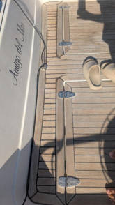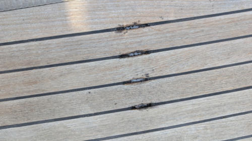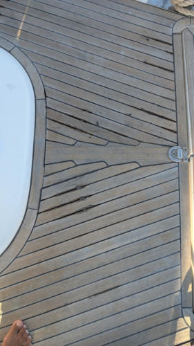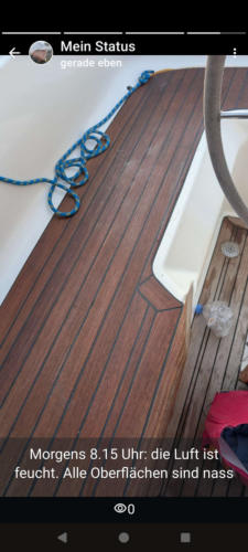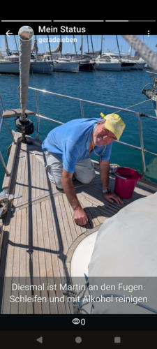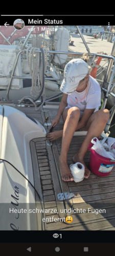 Am Nachmittag ist es dann endlich soweit: Wäsche hängt an der Reling und parallel verfugen wir das Teakdeck. Martin zieht die