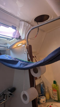 Wir sind voller Tatendrang und ersetzen die schwergängige Großschot durch eine neue mitgebrachtet dünnere Leine. Die flutscht nur noch