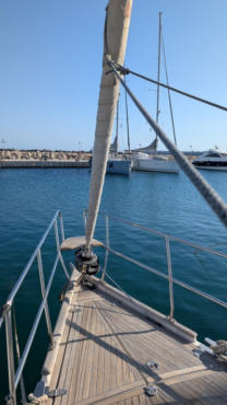 Die Befestigung der Rollreffanlage des Vorsegels wird gelöst und die Fockleinen wieder angebracht. Wir sind eigentlich klar zum Auslaufen :-)